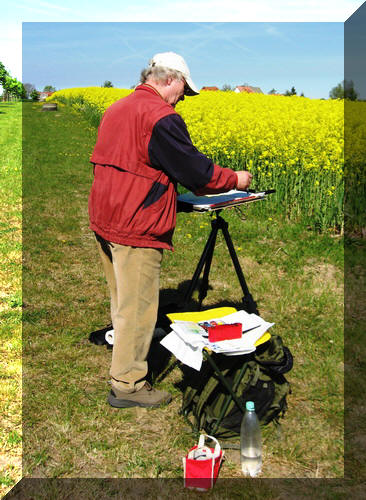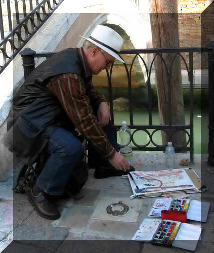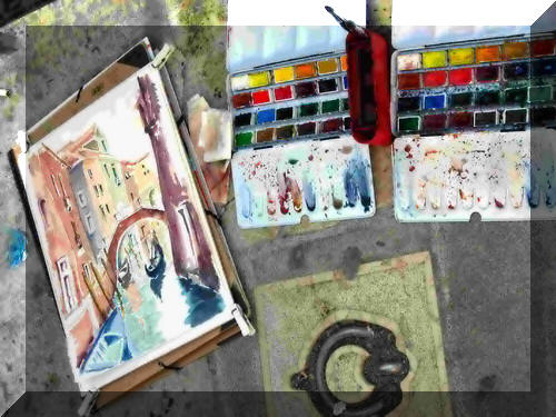 Jetzt reiste er nicht mehr in Sachen Turbinen und Walzwerke, sondern der Malerei wegen nach Rügen, Griechenland und mehrfach nach Venedig. Ihn reizen die Landschaften, die Farben, die Luft und das Wasser. Vor allem aber auch, Bauten, Häuser, Paläste und Kirchen und – wie sollte es bei Venedig anders sein Plätze, Brücken, Kanäle und Gondeln. Er reist nicht allein sondern mit Malgruppen, in denen er Anregungen erhält, in denen ein Austausch stattfindet, in denen auch immer jemand war, der auf die behutsame Weiterentwicklung drängte.