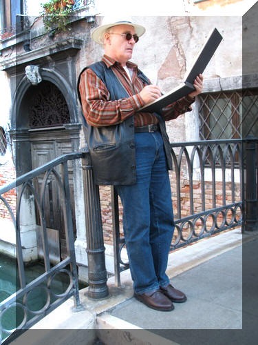 Heute zeigt er uns seine Venedig Studien mit der romantischten Einladung in einen Seelenzustand, den es gibt, nämlich den des Träumens. Venezianische Träume. Träumen davon, wie es war, als wir zum ersten Mal oder auch letztes Jahr wieder in Venedig waren und wie es sein wird, wenn wir im nächsten Jahr wieder hinfahren. Gibt es jemanden im Raum, der es wagen würde zu gestehen, noch nicht in Venedig gewesen zu sein? Ich kenne jemanden, der schon 32-mal dort war und auch jemanden, der erst aufgrund dieser Bilder den Traum umzusetzen beschlossen hat, nämlich wenigstens einmal im Leben nach Venedig zu fahren.